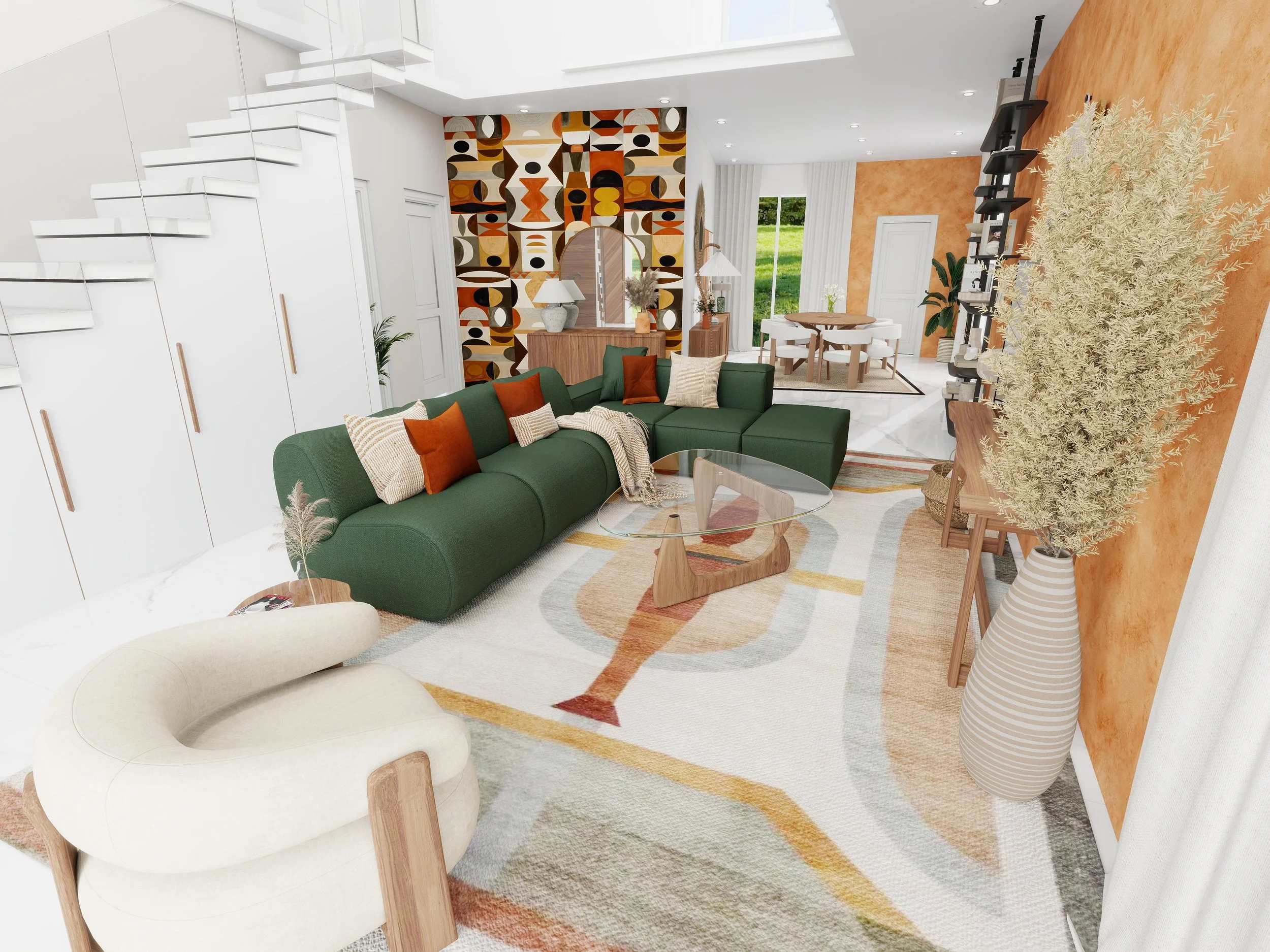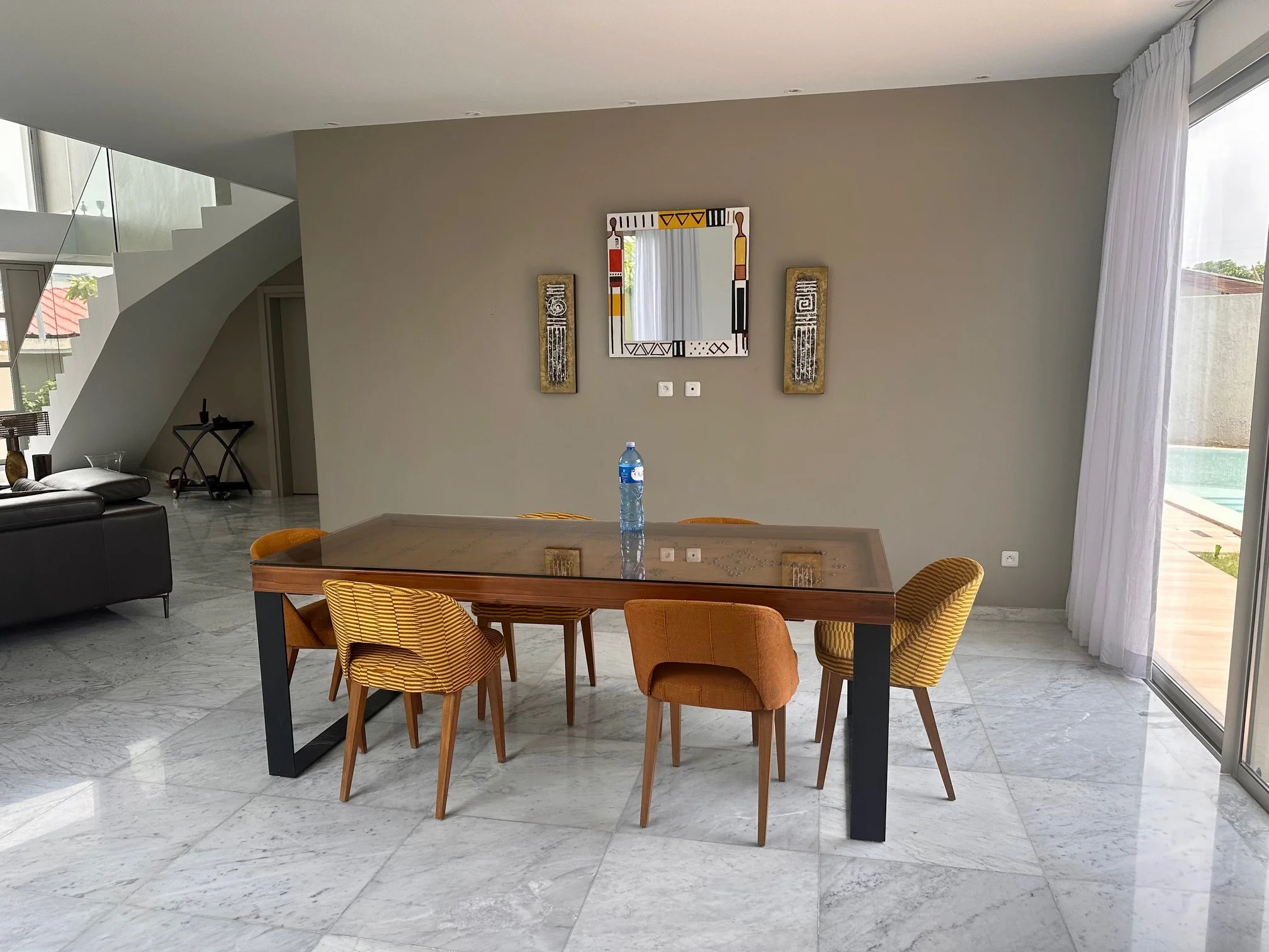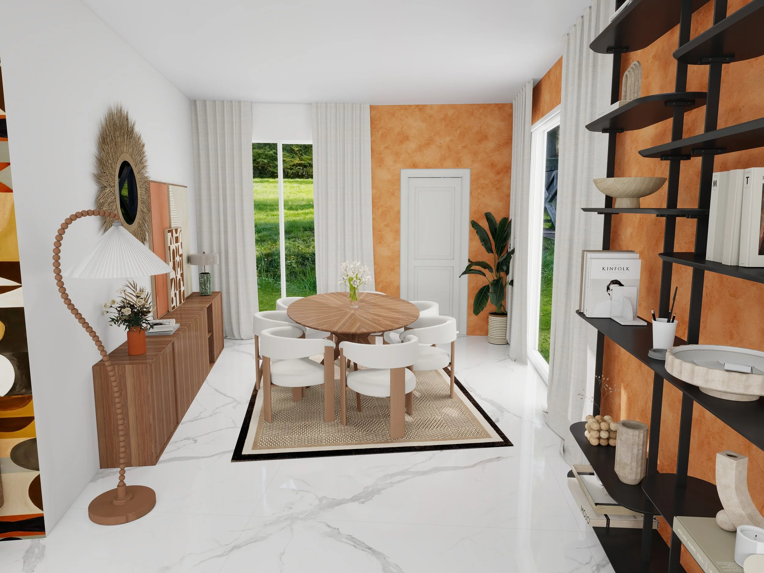 Installée en Côte d’Ivoire, ma cliente souhaitait donner plus de chaleur et de vie à sa grande pièce de 80 m², résolument moderne et épurée. Son envie : un intérieur coloré, accueillant et authentique, en harmonie avec l’architecture contemporaine de la maison.