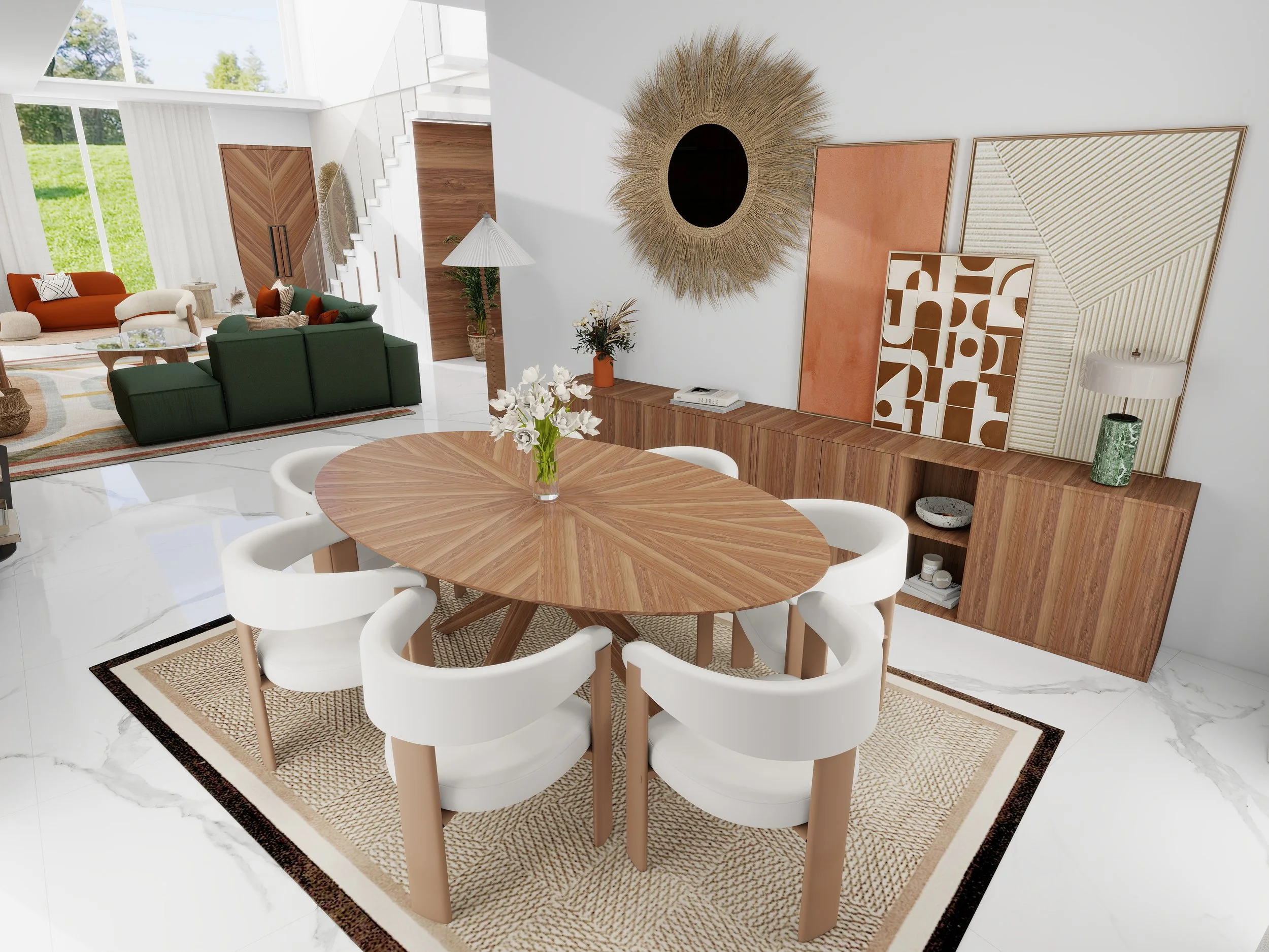 Le résultat : un intérieur où l’élégance ethnique dialogue avec l’architecture contemporaine, transformant cette pièce de vie en un espace chaleureux, raffiné et unique.