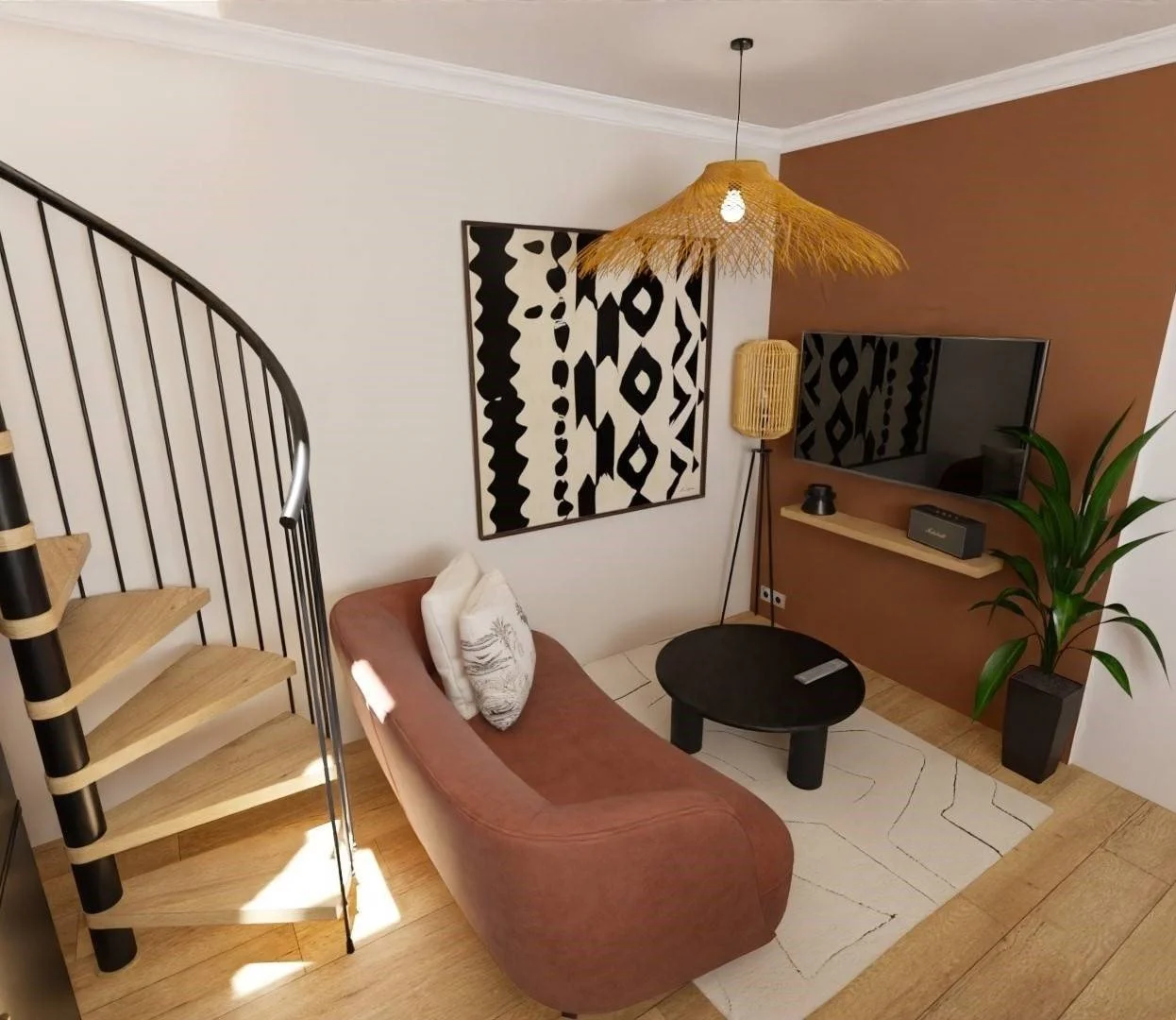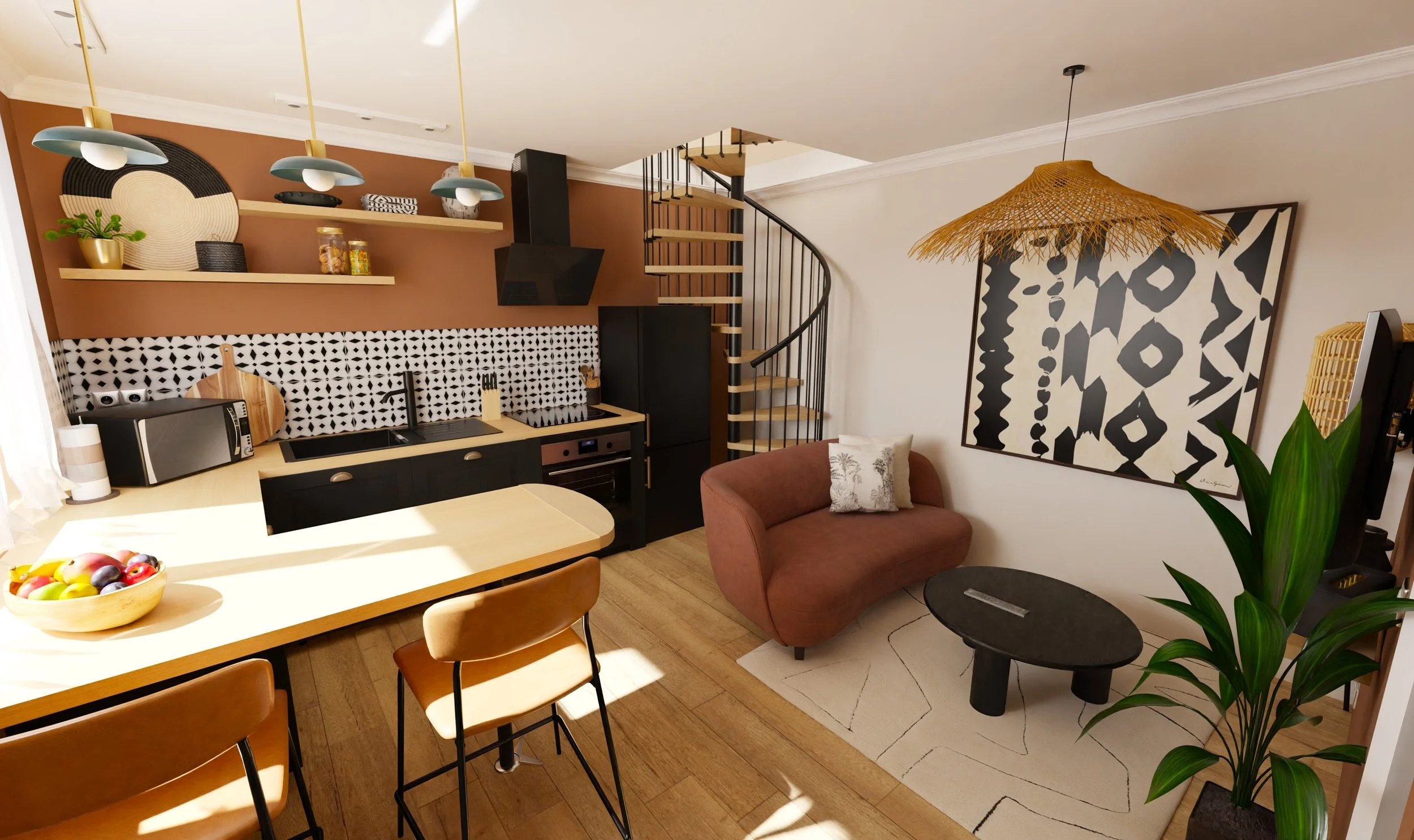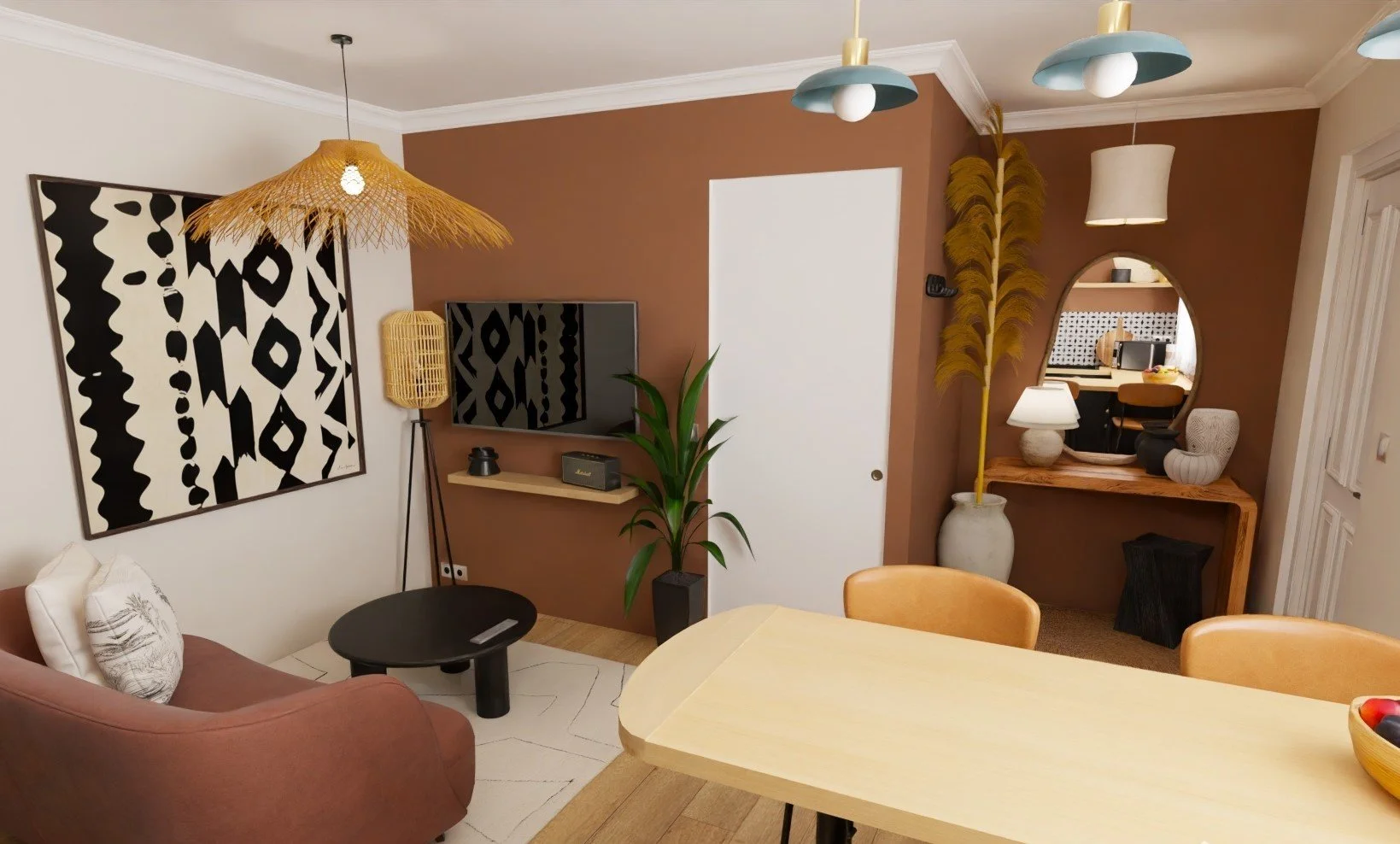 J’ai conçu un intérieur harmonieux en jouant avec les couleurs : des tons terracotta et brun pour la chaleur, un blanc cassé pour la luminosité et des touches de noir pour le caractère. Des formes géométriques ont dynamisé l’espace, tandis que des matériaux naturels ont apporté confort et élégance. Chaque élément a été pensé pour une circulation fluide et une fonctionnalité optimale.