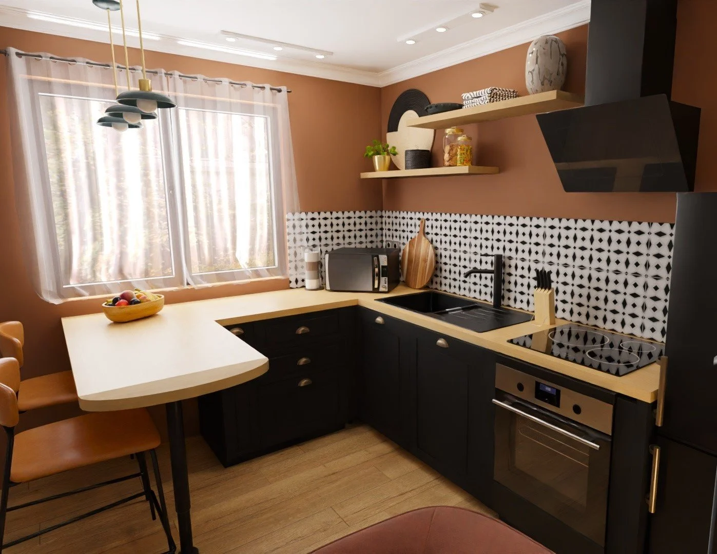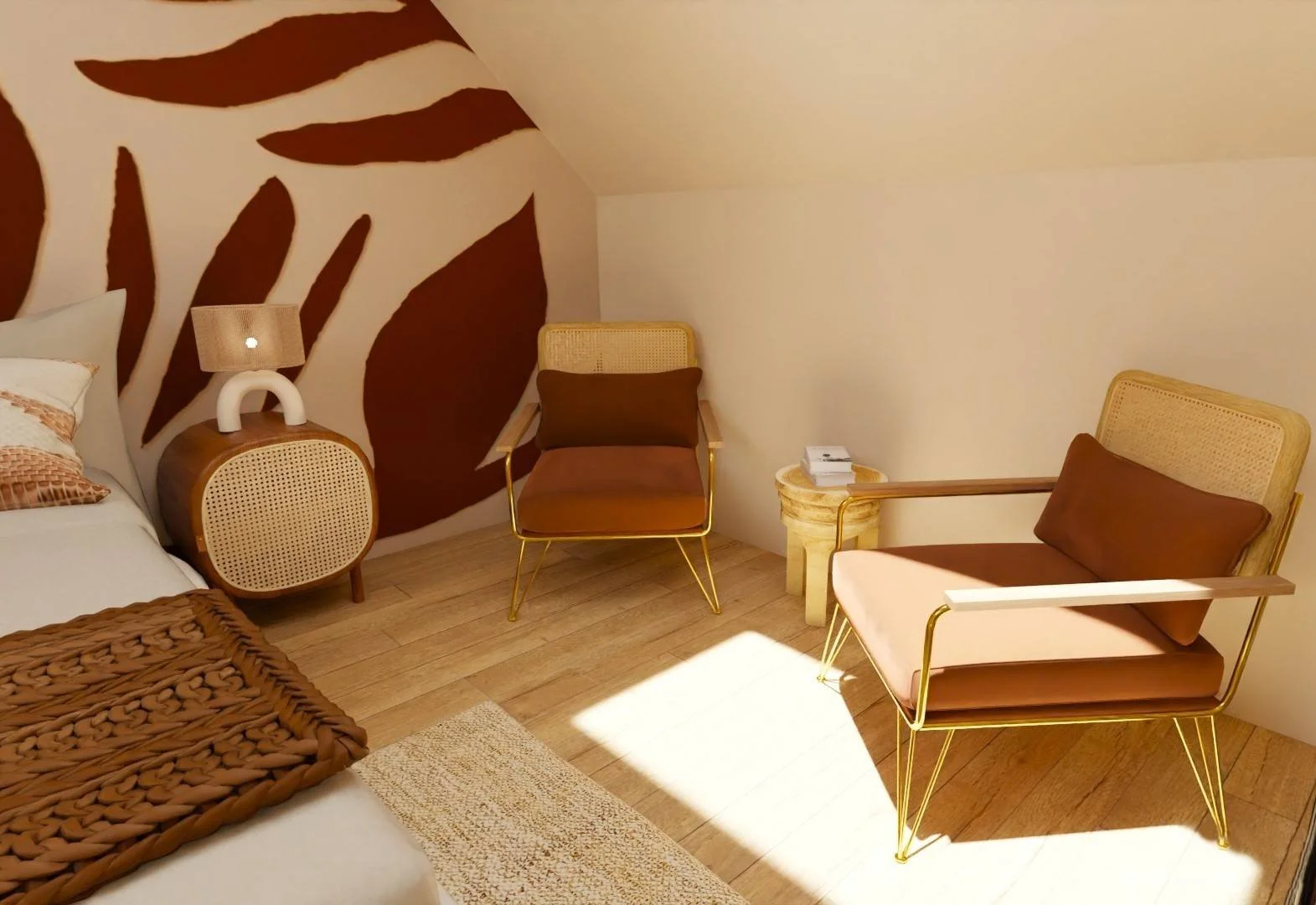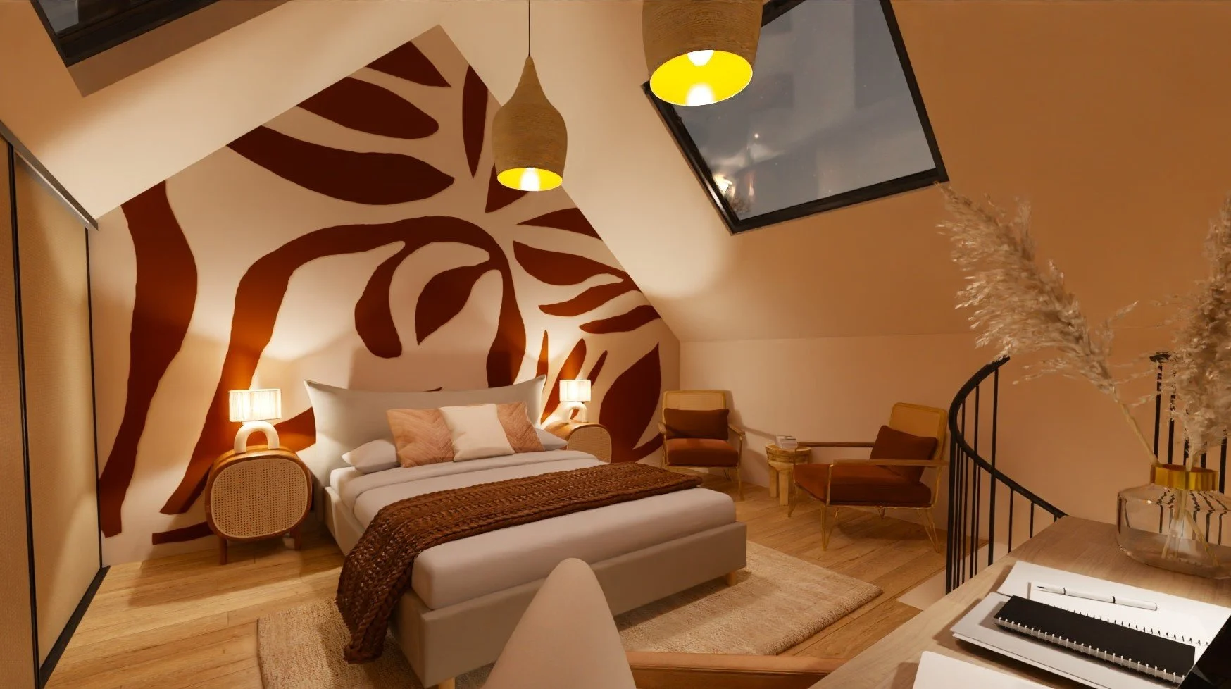 J’ai conçu un intérieur harmonieux en jouant avec les couleurs : des tons terracotta et brun pour la chaleur, un blanc cassé pour la luminosité et des touches de noir pour le caractère. Des formes géométriques ont dynamisé l’espace, tandis que des matériaux naturels ont apporté confort et élégance. Chaque élément a été pensé pour une circulation fluide et une fonctionnalité optimale.