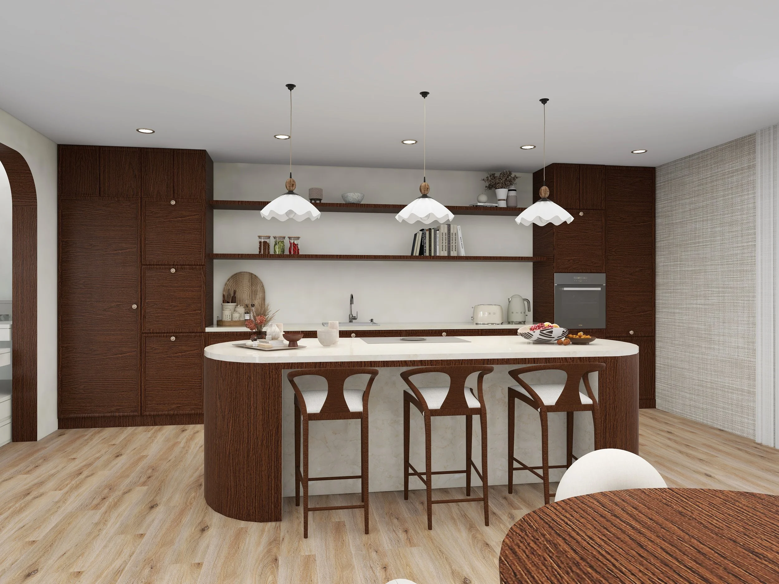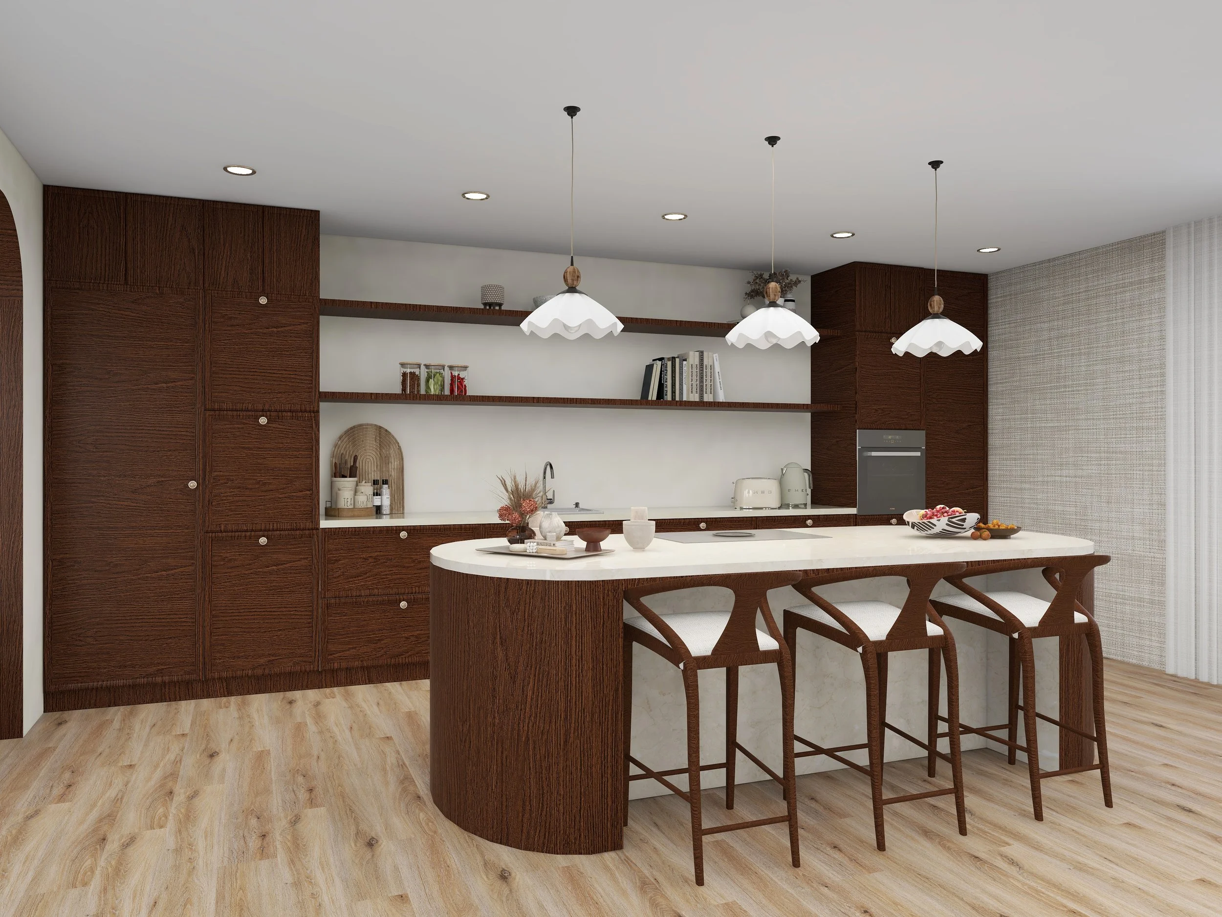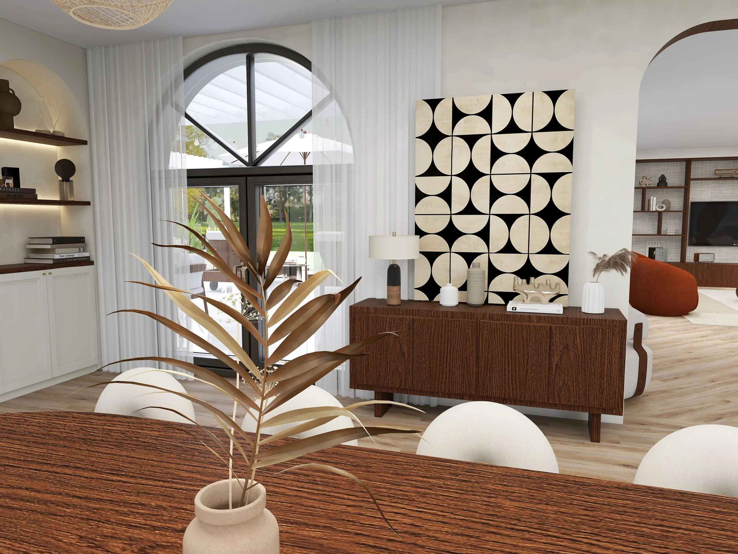 J’ai conçu un intérieur mêlant bois de noyer, pierre naturelle, lin et chaux, en harmonie avec la façade en pierre. Les formes graphiques et arrondies apportent fluidité et modernité, tandis que de grandes baies vitrées ouvrent l’espace sur une terrasse de 90 m². Chaque pièce a été pensée comme une œuvre d’art, avec des éléments forts mis en valeur par un agencement épuré et des luminaires sculpturaux.